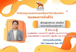 ก.พ. 18 🎉 ขอแสดงความยินดีกับ เด็กหญิงปริยากร คริเสถียร นักเรียนชั้น ป.5 ได้รับรางวัลชนะเลิศอันดับ 1 จากการแข่งขันเทควันโด CMU Taekwondo Open 2026