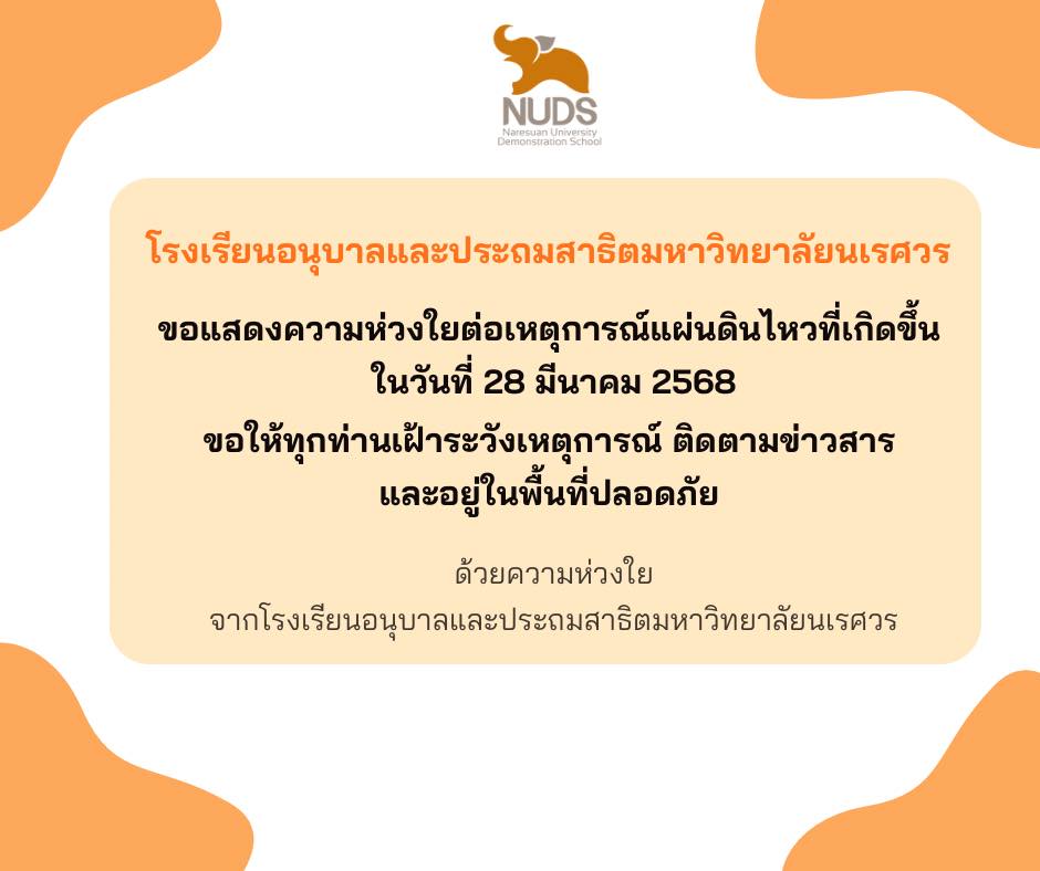 ขอแสดงความห่วงใยต่อเหตุการณ์แผ่นดินที่เกิดขึ้นในวันที่ 28 มีนาคม 2568 ด้วยความห่วงใย โรงเรียนอนุบาลและประถมสาธิตมหาวิทยาลัยนเรศวร FacebookFacebookLINELine