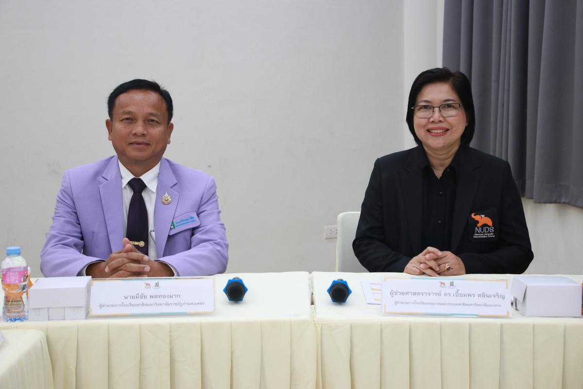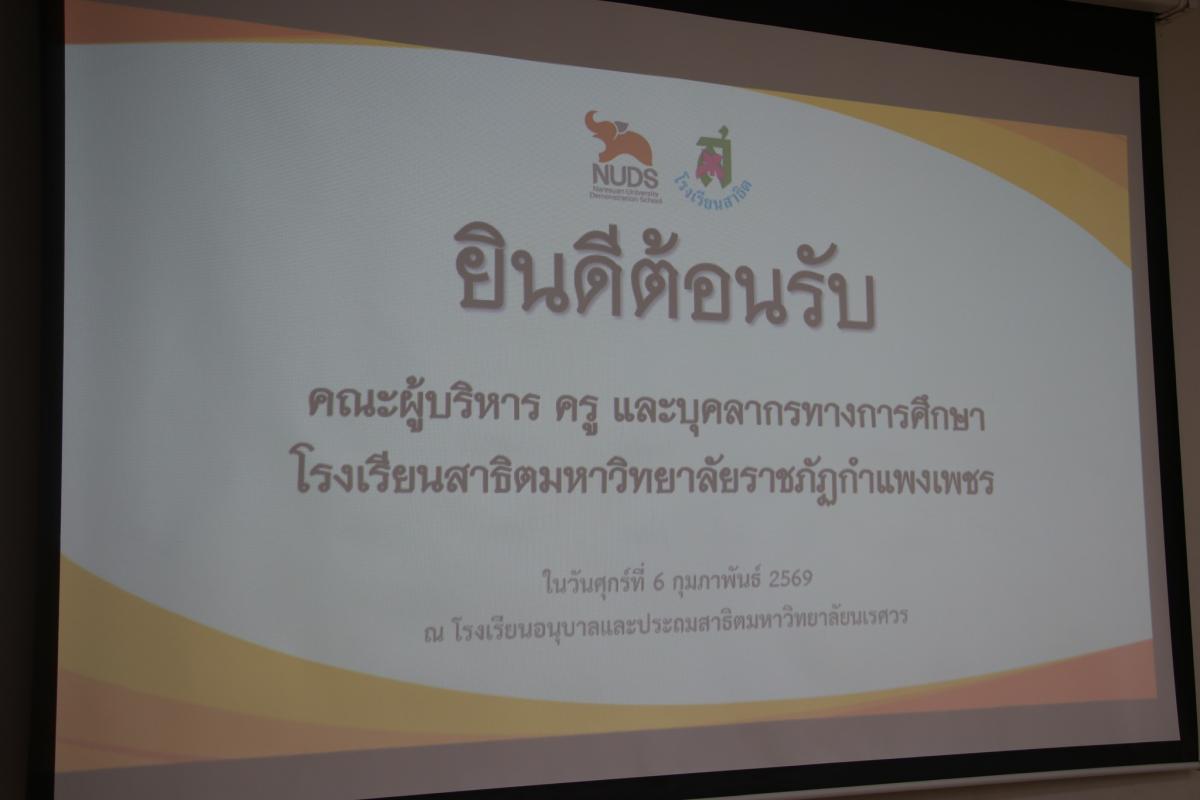 วันที่ 6 กุมภาพันธ์ 2569 โรงเรียนอนุบาลและประถมสาธิตมหาวิทยาลัยนเรศวร นำโดย ผู้ช่วยศาสตราจารย์ ดร.เอื้อมพร หลินเจริญ ผู้อำนวยการโรงเรียน และรองศาสตราจารย์ ดร.สถิรพร เชาวน์ชัย รองผู้อำนวยการโรงเรียนอนุบาลและประถมสาธิตมหาวิทยาลัยนเรศวร พร้อมด้วยคณะครู และบุคลากร ให้การต้อนรับคณะศึกษาดูงานจากโรงเรียนสาธิต (ภายใต้ความร่วมมือระหว่างสำนักงานเขตพื้นที่การศึกษาประถมศึกษา กำแพงเพชร เขต 1 กับมหาวิทยาลัยราชภัฏกำแพงเพชร) นำโดย ดร.มีชัย พลทองมาก ผู้อำนวยการโรงเรียนสาธิตฯ กำแพงเพชร ว่าที่ร้อยตรีพิสิทธิ์ชัย แย้มโกเมน และรองผู้อำนวยการโรงเรียนสาธิตฯ กำแพงเพชร พร้อมด้วยคณะครูและบุคลากรของโรงเรียน จำนวน 40 ท่าน ณ โรงเรียนอนุบาลและประถมสาธิตมหาวิทยาลัยนเรศวร ในการเข้าศึกษาดูงาน เยี่ยมชมโรงเรียน และการบริหารจัดการและการจัดการเรียนการสอนของโรงเรียนในระดับชั้นอนุบาลและระดับชั้นประถมศึกษา ร่วมพูดคุยแลกเปลี่ยนข้อมูลด้านการจัดการเรียนการสอน ด้านการบริหารจัดการของโรงเรียน การบริหารจัดการความปลอดภัยและสิ่งแวดล้อมภายในโรงเรียน เพื่อเป็นแนวทางในการพัฒนาการจัดการเรียนการสอนและการบริหารสถานศึกษาต่อไป