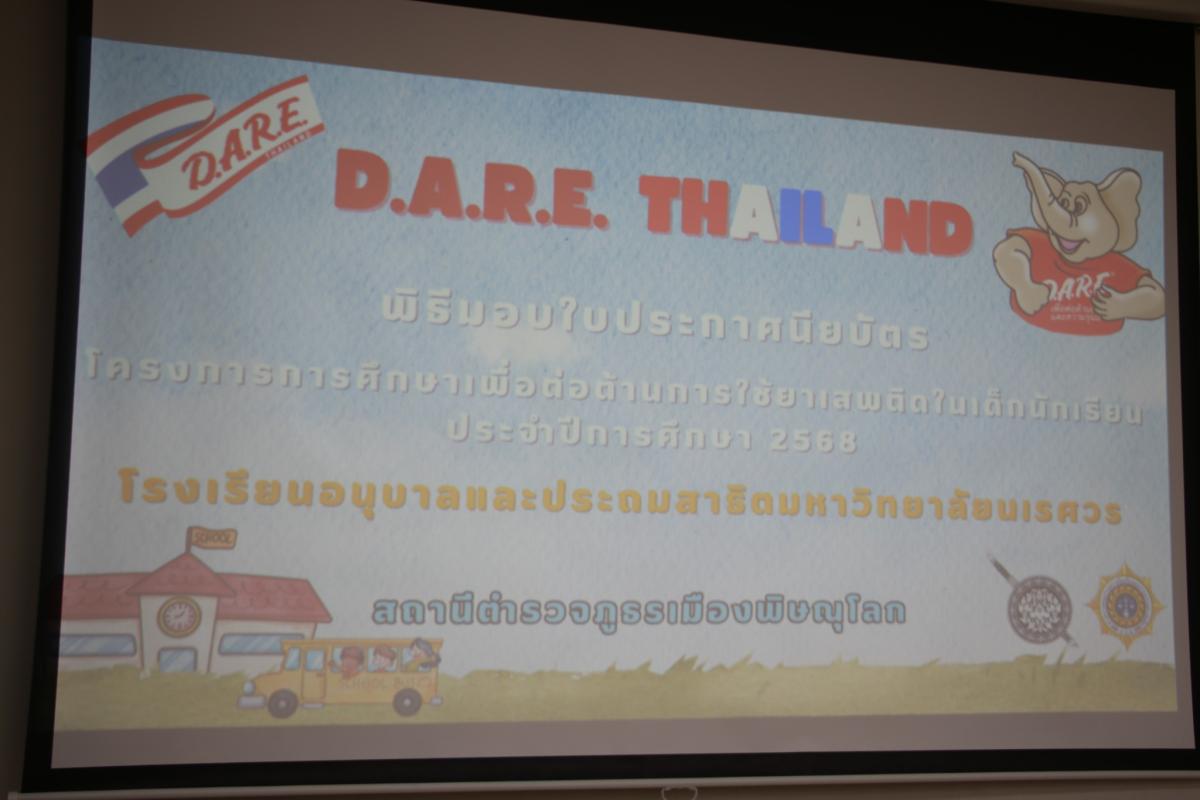 วันที่ 10 มีนาคม 2569 โรงเรียนอนุบาลและประถมสาธิตมหาวิทยาลัยนเรศวร ร่วมกับสถานีตำรวจภูธรเมืองพิษณุโลก จัดพิธีมอบประกาศนียบัตรโครงการการศึกษาเพื่อต่อต้านการใช้ยาเสพติดในเด็กนักเรียน (D.A.R.E.ประเทศไทย) ให้กับนักเรียนระดับชั้นประถมศึกษาปีที่ 5 จำนวน 57 คน ที่ได้สำเร็จหลักสูตรโครงการการศึกษาเพื่อต่อต้านการใช้ยาเสพติดในเด็กนักเรียน (D.A.R.E.ประเทศไทย) โดยได้รับเกียรติจากพันตำรวจโท ณัฐวิทย์ ใจชมชื่น รองผู้กำกับป้องกันและปราบปราม สถานีตำรวจภูธรเมืองพิษณุโลก เป็นประธานในพิธีและมอบเกียรติบัตรให้กับโรงเรียนและนักเรียนที่สำเร็จหลักสูตร พร้อมทั้งมอบเกียรติบัตรให้กับนักเรียนที่ได้รับรางวัลเรียงความดีเด่น ต่อมาตัวแทนนักเรียนได้อ่านเรียงความและกล่าวคำปฏิญาณตนร่วมกัน อีกทั้งได้รับเกียรติจากผู้ช่วยศาสตราจารย์ ดร.เอื้อมพร หลินเจริญ ผู้อำนวยการโรงเรียน กล่าวขอบคุณและกล่าวความรู้สึกต่อโครงการฯ ทางโรงเรียนขอขอบคุณสถานีตำรวจภูธรเมืองพิษณุโลก คณะคุณครูตำรวจ D.A.R.E. ที่ได้จัดโครงการให้ความรู้ที่มีประโยชน์ต่อนักเรียน เพื่อนำไปปรับใช้ในอนาคตต่อไป