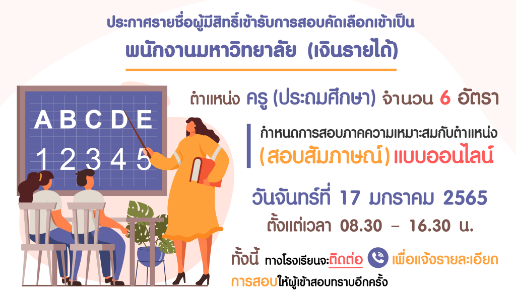 ประกาศรายชื่อผู้มีสิทธิ์เข้ารับการสอบคัดเลือกเข้าเป็นพนักงานมหาวิทยาลัย (เงินรายได้) ประกาศรายชื่อผู้มีสิทธิ์เข้ารับการสอบคัดเลือกเข้าเป็นพนักงานมหาวิทยาลัย (เงินรายได้) ตำแหน่ง ครู (ประถมศึกษา) จำนวน 6 อัตรา ครูภาษาไทย จำนวน 1 อัตราครูสังคมศึกษา จำนวน 1 อัตราครูวิทยาศาสตร์ จำนวน 1 อัตราครูคณิตศาสตร์ จำนวน 1 อัตราครูภาษาอังกฤษ จำนวน 1 อัตราครูพลศึกษา จำนวน 1 อัตรา กำหนดการสอบภาคความเหมาะสมกับตำแหน่ง (ภาคการทดสอบการสอนและภาคการสอบสัมภาษณ์ รูปแบบ Online)วันที่ 17 มกราคม 2565 เวลา 08.30 – 16.30 น.หมายเหตุ:ด้วยประกาศมหาวิทยาลัยนเรศวร เรื่องมาตรการเฝ้าระวังการแพร่ระบาดของโรคติดเชื้อไวรัสโคโรนา 2019 (COVID 19) หลังเทศกาลปีใหม่ 2565 (ฉบับที่ 2/2565) ลงวันที่ 5 มกราคม 2565 กำหนดให้จำกัดการเข้าพื้นที่ในมหาวิทยาลัยนเรศวร รูปแบบการสอบภาคความเหมาะสมกับตำแหน่งจึงเปลี่ยนเป็นรูปแบบ Onlineทั้งนี้ ทางโรงเรียนจะติดต่อเพื่อแจ้งรายละเอียดการสอบให้ผู้เข้าสอบทราบอีกครั้งขออภัยในความไม่สะดวกมา ณ ทีนี้ ประกาศรายชื่อและรายละเอียดเพิ่มเติม : https://www.personnel.nu.ac.th/…/work/center/2565/03.pdf FacebookFacebookLINELine